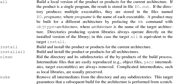 To build a product, change to the directory containing its source and invoke mk with the appropriate target as an argument. All mkfiles provide the following standard targets: