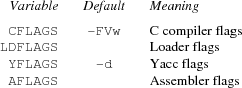 The value of a variable is overridden by assigning a new value to the variable. Most variable overrides modify the values of flags or the names of commands executed in recipes. For example, the default value of CFLAGS is often overridden or augmented and the ANSI/POSIX Computing Environment is selected by setting the CC and LD variables to pcc.
