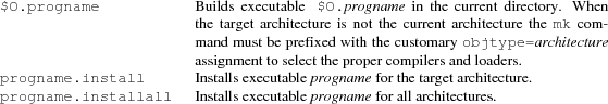 In addition to the five standard targets, additional targets may be supplied by each generic mkfile or by the directory’s mkfile.