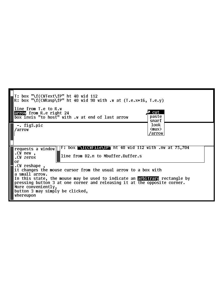 The interactive style was influenced by jim,1 an early cut-and-paste editor for the Blit, and by mux,8 the Blit window system. Mux merges the original Blit window system, mpx,1 with cut-and-paste editing, forming something like a multiplexed version of jim that edits the output of (and input to) command sessions rather than files.