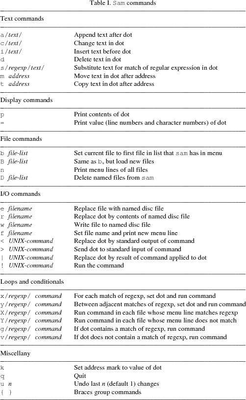 One more command: p prints the contents of dot. Table I summarizes sam’s commands.