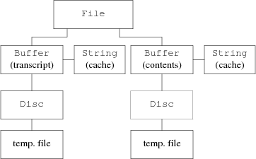 A File comprises a String to hold the file name and some ancillary data such as dot and the modified bit. The most important components, though, are a pair of Buffers, one called the transcript and the other the contents. Their use is described in the next section.